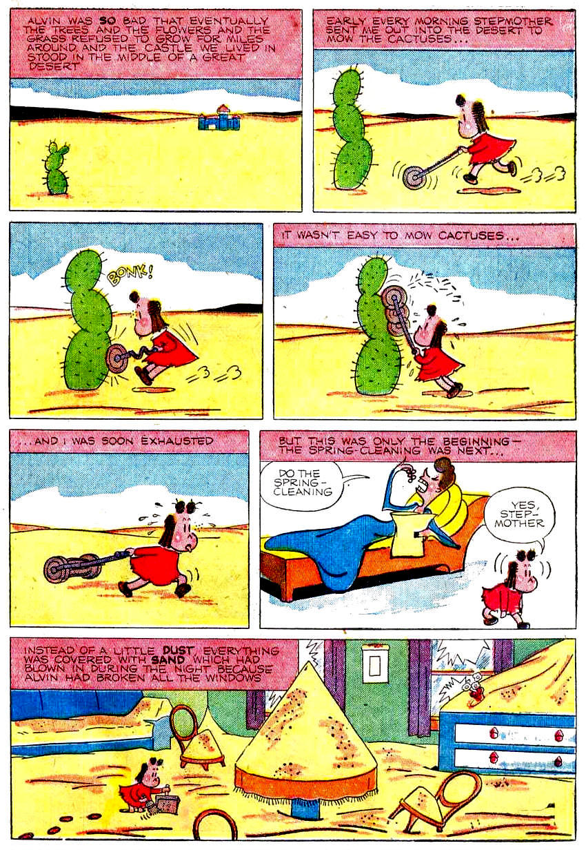 Something I loved especially about the Little Lulu comics were the stories-within-the-stories she told Alvin, the “poor little girl” fables which were always inventive and funny. “Lulu In Distress, a Tragedy” is from Dell Four Color #110 (1946), early in John Stanley’s brilliant career as Lulu’s scribe. He did the artwork for the story, also.