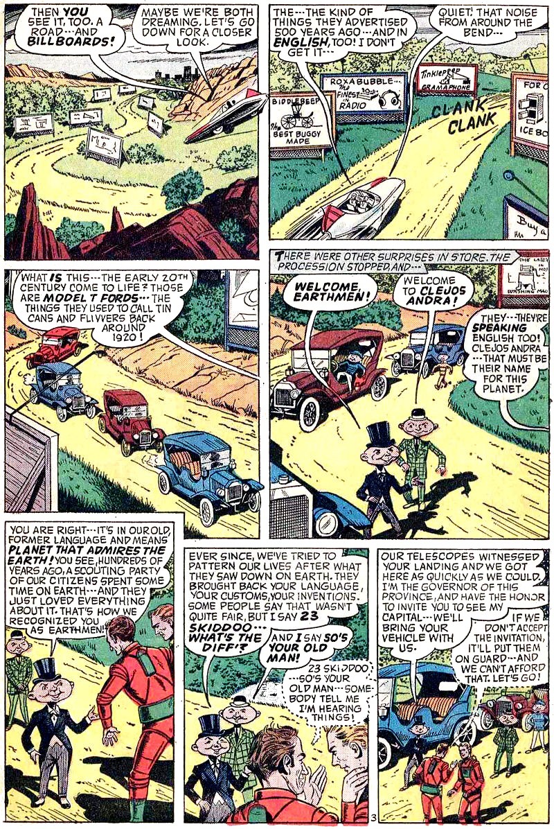 Clejos Andra is a planet full of Earth-groupies. People from that planet visited our planet in the 1920s and liked it so much they went home and emulated our culture. (From what is shown it's American culture.) Five hundred years in the future some Earth people visit Clejos Andra and are welcomed with open arms, only to turn on their adoring hosts with treachery and violence. It would be my guess that any aliens from space doing any visiting on our planet would learn in no time we can be a very violent and hostile bunch. I don’t know why the Clejos Andrans missed that aspect of our culture during their stay.